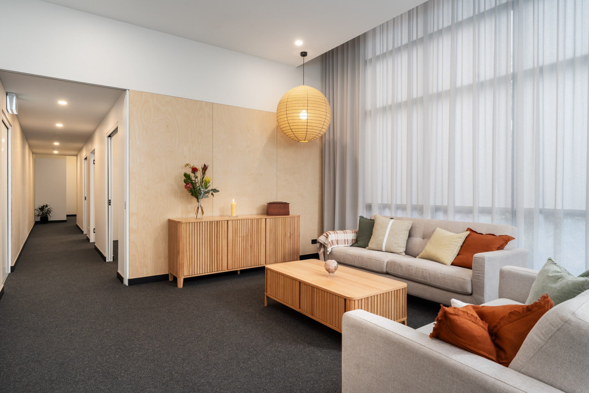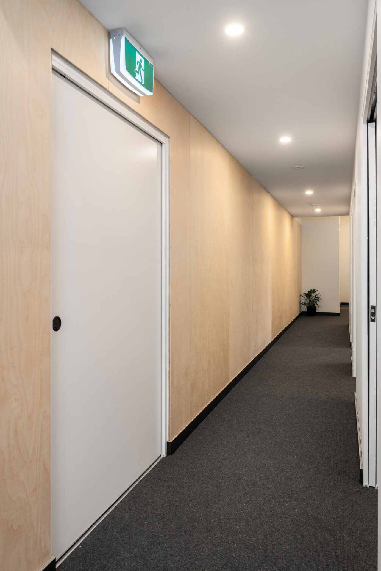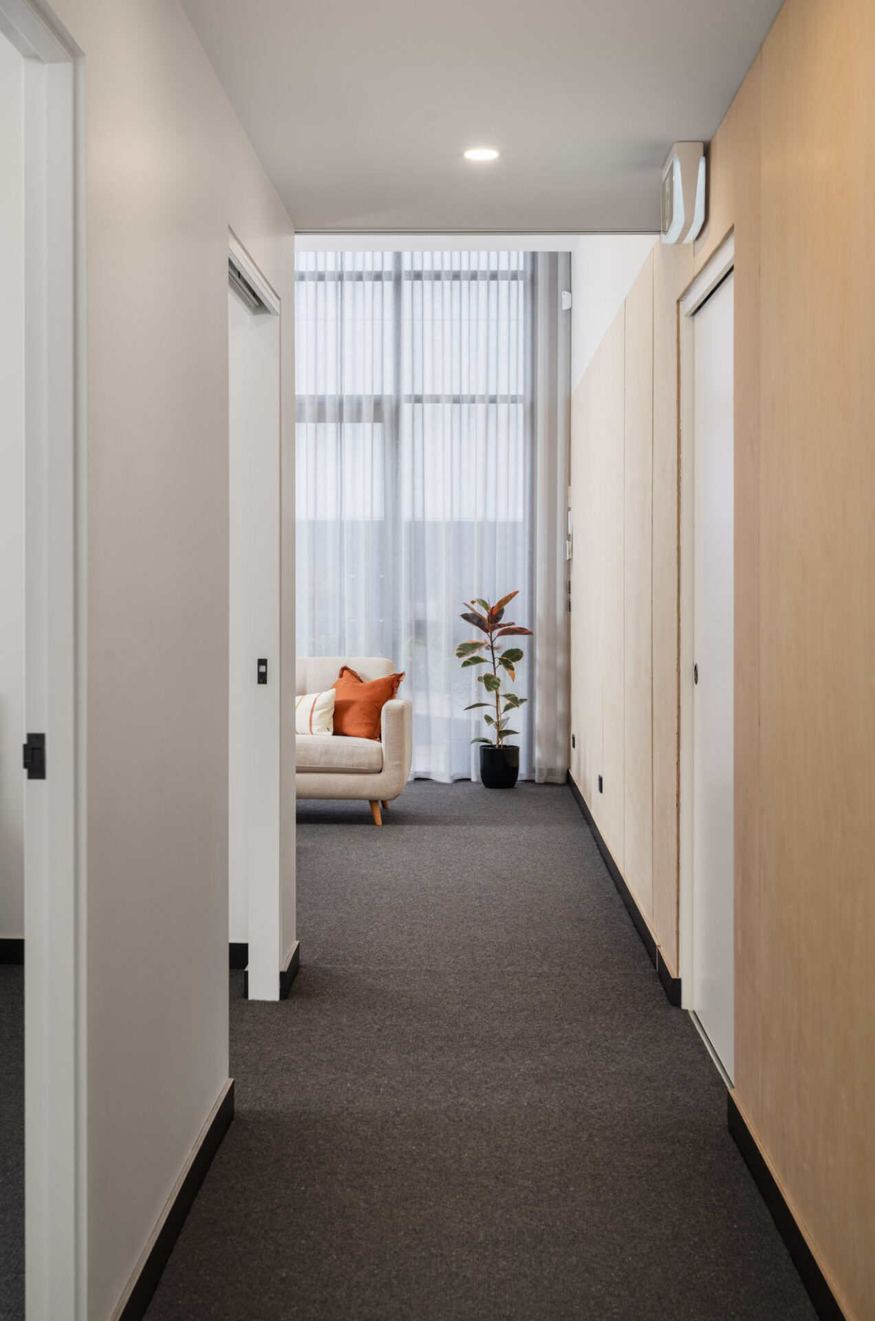 The long hallway, a central feature of the space, is a perfect example of this commercial design philosophy. It’s not just a corridor; it’s a journey. The timber-panelled walls on one side and a clean white wall on the other create a visual rhythm. Recessed downlights in the ceiling provide a soft, ambient glow, illuminating the path without being harsh or overwhelming. The clean lines and minimalist approach make the space feel open and uncluttered, which is essential for a commercial office fitout that aims to be a calming presence. A small, carefully placed potted plant at the end of the hallway adds a touch of greenery, a subtle nod to life and nature that aligns with the business’s holistic approach. This hallway acts as a transition zone, allowing visitors to decompress and prepare for the conversations they are about to have.