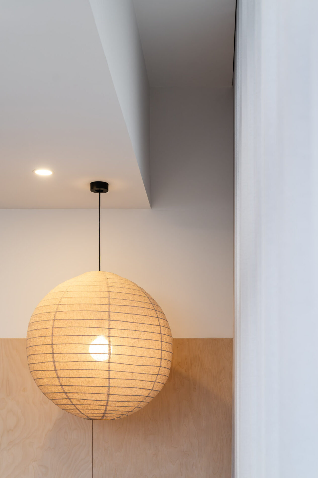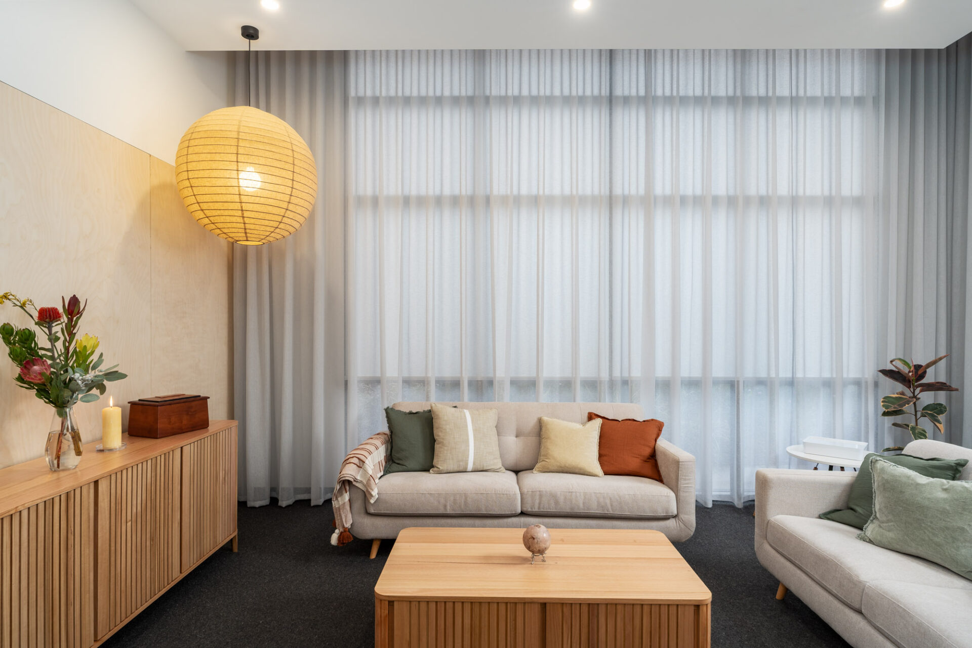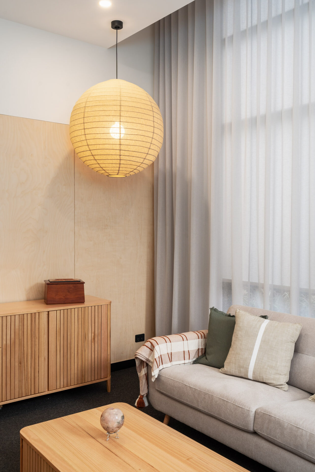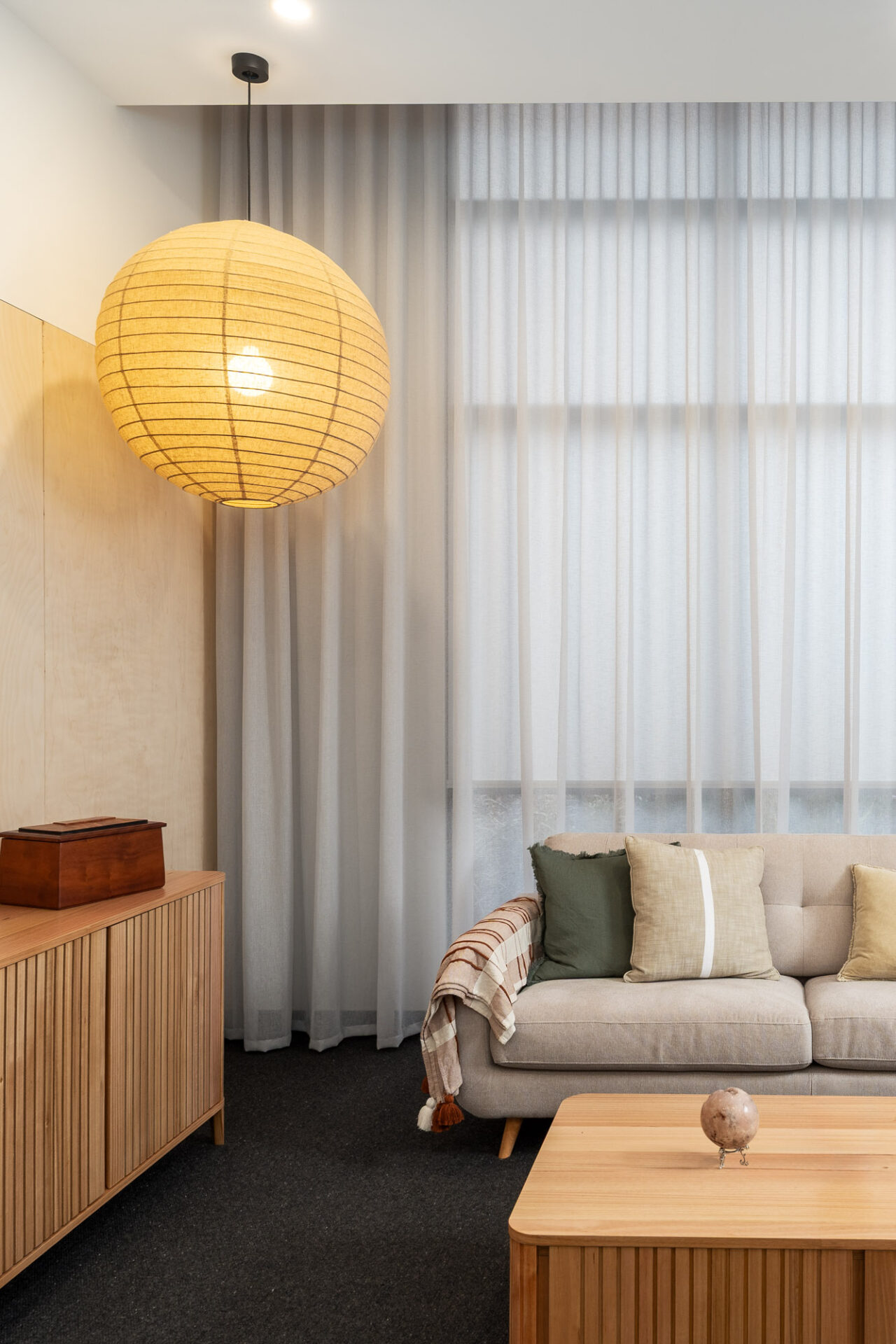 The waiting area is the heart of this commercial office fitout, a place designed for comfort and contemplation. Total Fitouts Newcastle has expertly curated this space to feel more like a living room than a typical corporate environment. The furniture is the centrepiece: a comfortable-looking sofa and armchairs in a neutral, light-coloured fabric. Padded cushions in varying shades of green, cream, and a pop of warm terracotta add a touch of colour and texture, making the space feel personal and lived-in. The centrepiece of the room, both literally and figuratively, is the large, spherical paper lantern hanging from the ceiling. Its soft, diffused light creates a gentle and welcoming ambience, a stark contrast to the harsh, bright lighting often found in commercial spaces. This specific lighting choice is a powerful commercial design feature within this commercial office fitout, as it contributes significantly to the overall sense of peace and tranquillity.