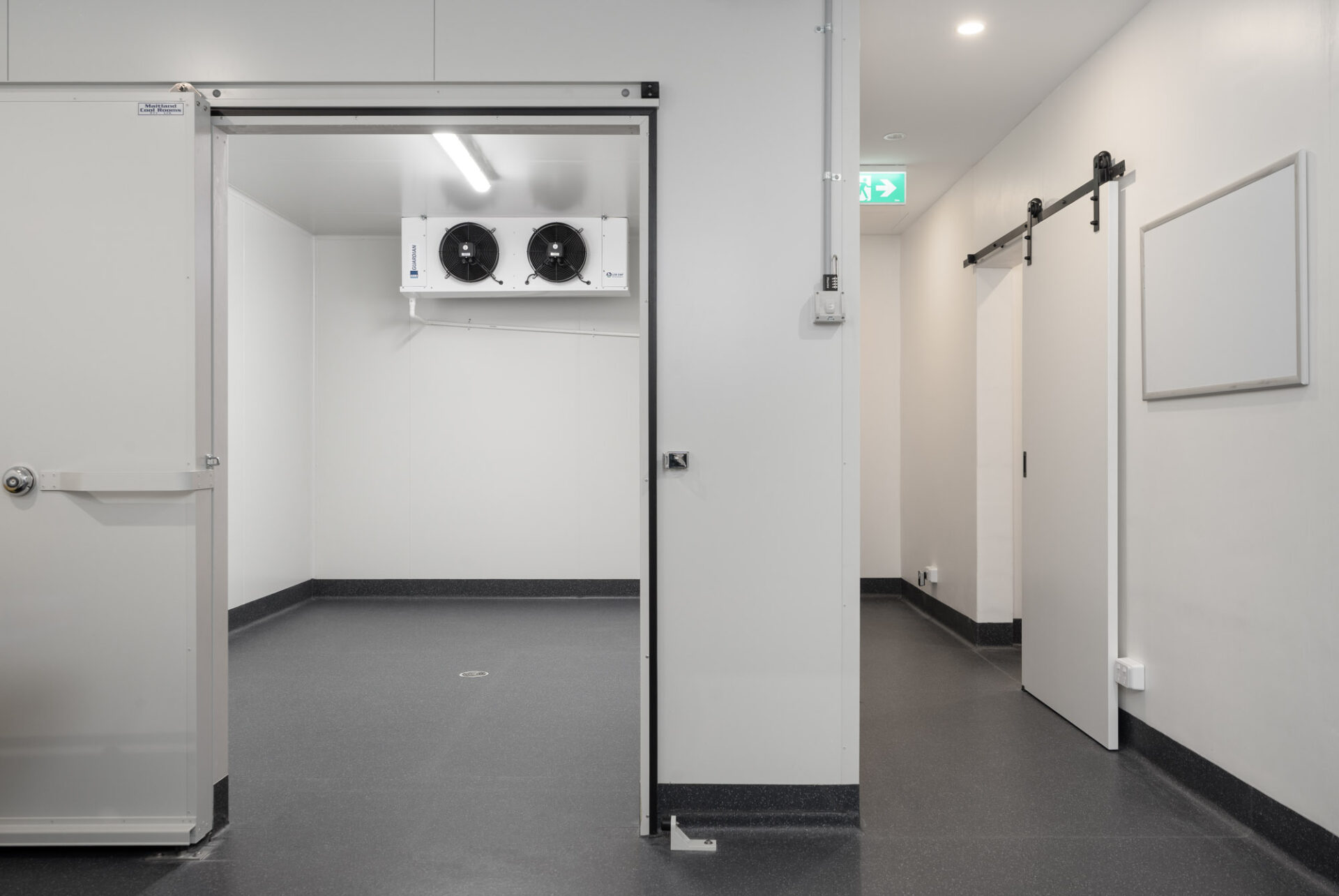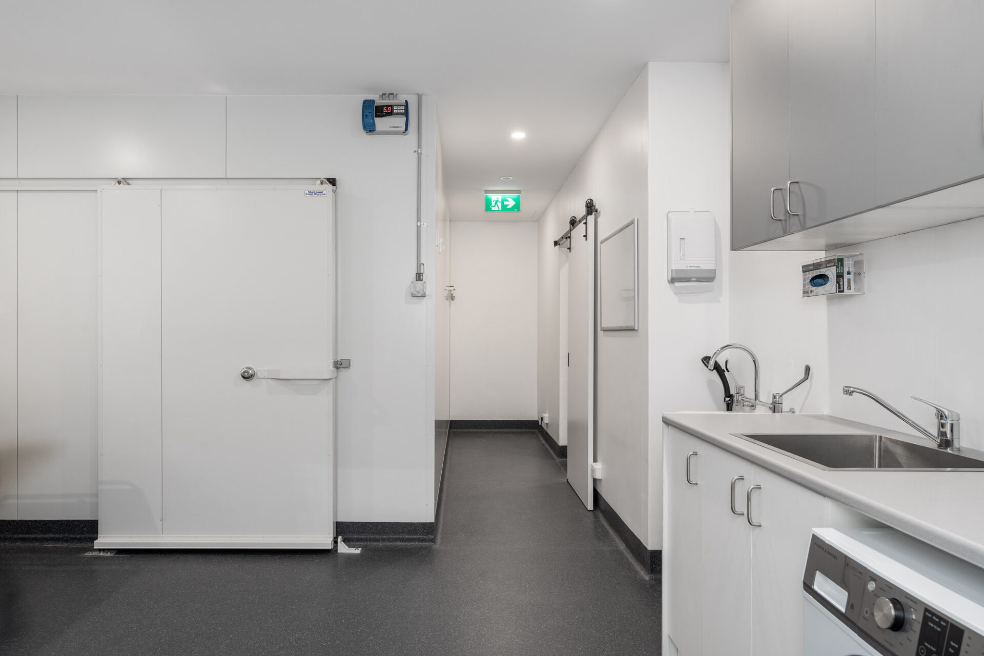 Perhaps the most unique aspect of this commercial office fitout is the integration of the cold room and other practical elements. As a funeral director’s office, there is a need for specific, highly functional spaces. The Total Fitouts Newcastle team have managed to incorporate these without compromising the overall design integrity. The large, white doors of the cold room, while functional, blend into the white walls of the corridor, creating a seamless and unintrusive look. The clean, bright interior of the cold room, showcases a sterile and well-lit environment that is necessary for the business’s operations. This demonstrates the ability of the Total Fitouts team to marry a sensitive interior design aesthetic with highly specialised practical requirements, a crucial skill in a complex commercial office fitout.