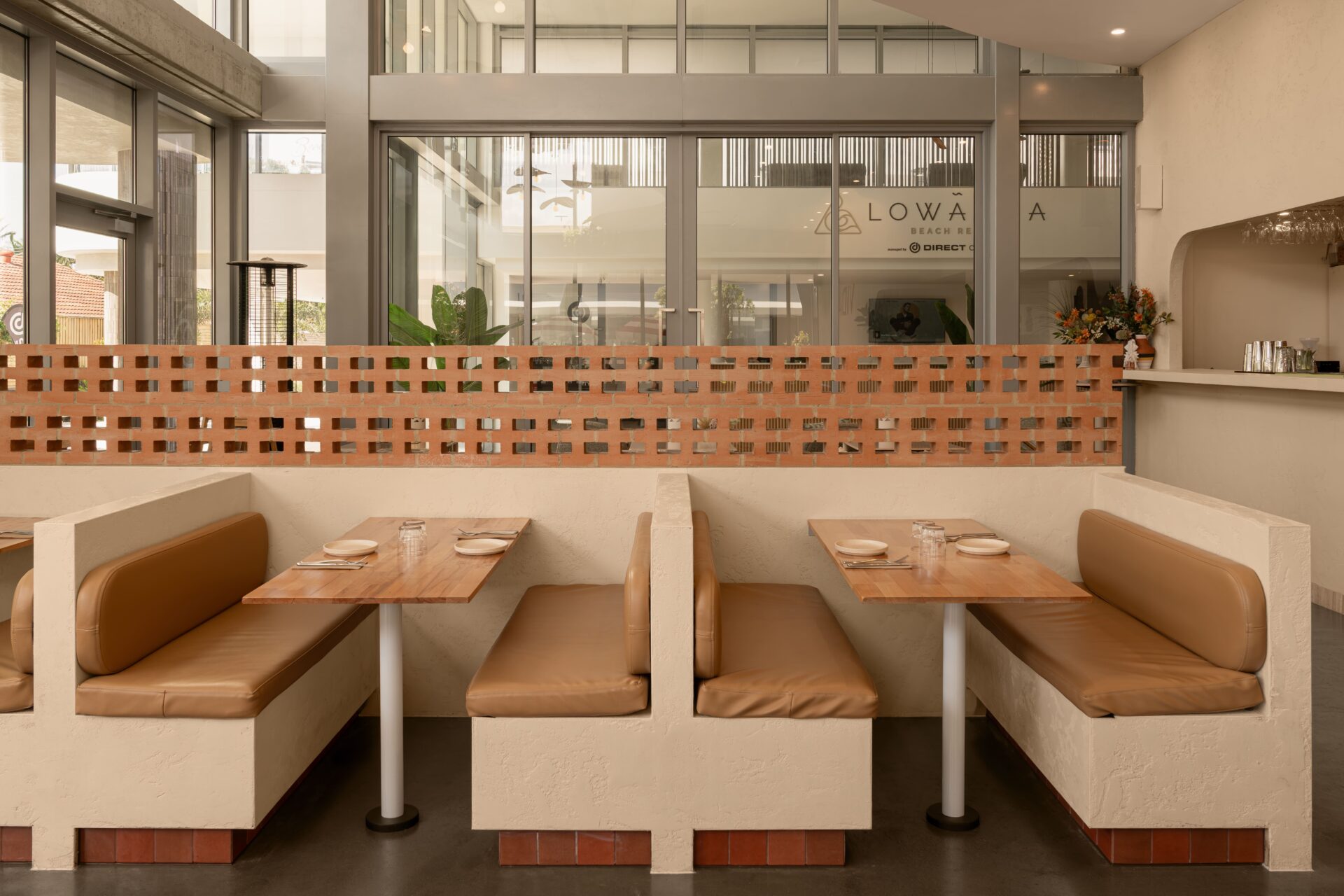 One of the standout features of this hospitality fitout is the sophisticated use of terracotta and custom tiling, reflecting Mexico’s rich material heritage while maintaining a modern aesthetic. A low, permeable partition wall constructed from terracotta breeze blocks defines the main dining area while separating casual bar seating. The geometric voids allow natural light to filter through, maintaining visual connections between spaces and promoting a communal atmosphere. This design draws inspiration from traditional Mexican techniques for managing light and heat but is reimagined as a decorative, functional focal point.