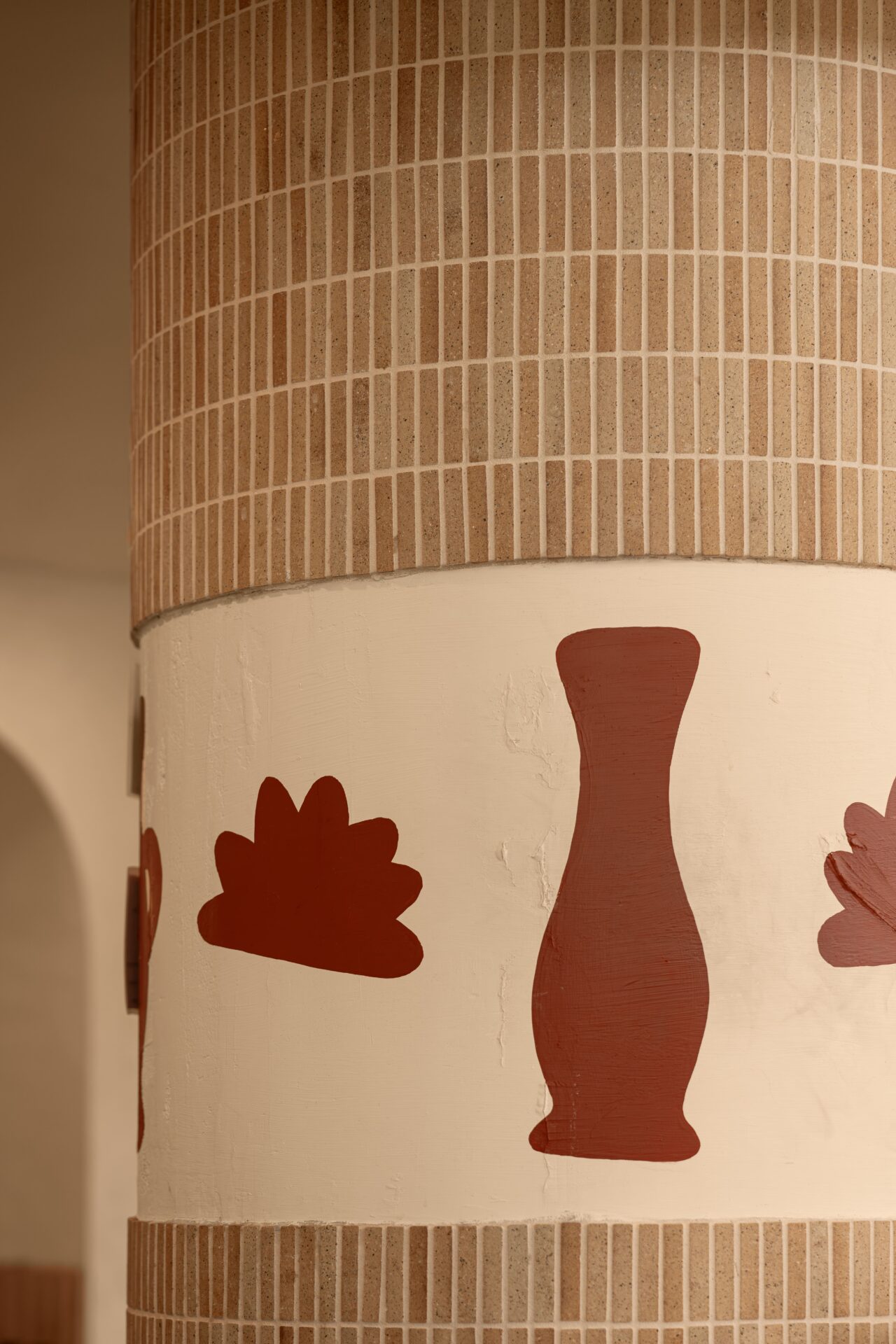 A structural column has been transformed into a hand-painted work of art. The upper portion features small, vertically oriented tiles, while the lower section is painted in the creamy wall tone and adorned with bold, terracotta-red abstract shapes, including vases and floral motifs. These artistic touches introduce colour, personality, and craftsmanship at eye level. Biophilic elements, such as hanging planters and cascading greenery, bring life and freshness into the interior, connecting guests with nature and reinforcing the relaxed, natural aesthetic. Every detail of this hospitality fitout reflects Total Fitouts Sunshine Coast’s commitment to creating interiors that are both functional and visually engaging.